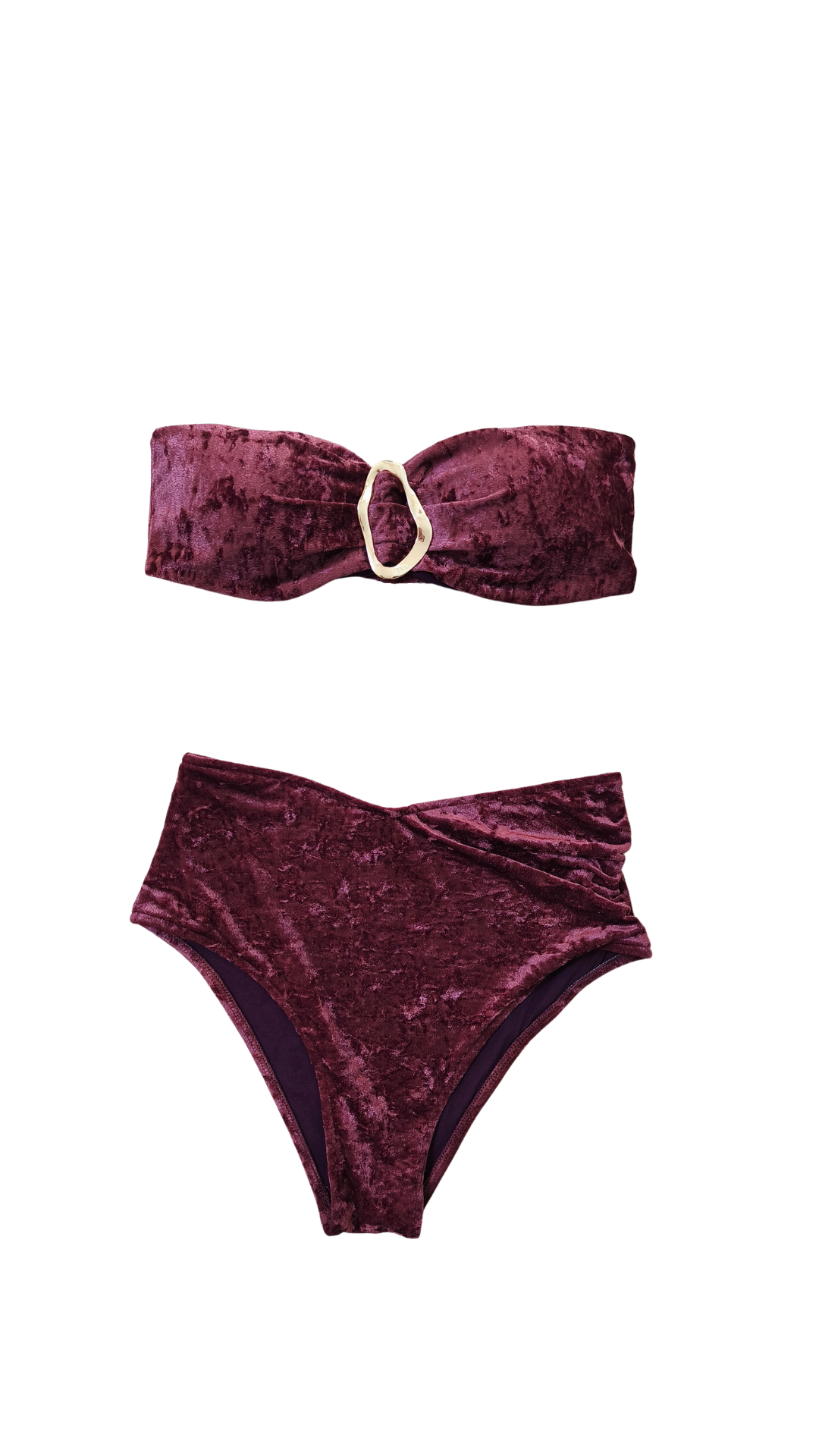 Elegante bikini con top badeau y detalle metálico dorado en el centro, combinada con la braguita alta a juego que estiliza la silueta.