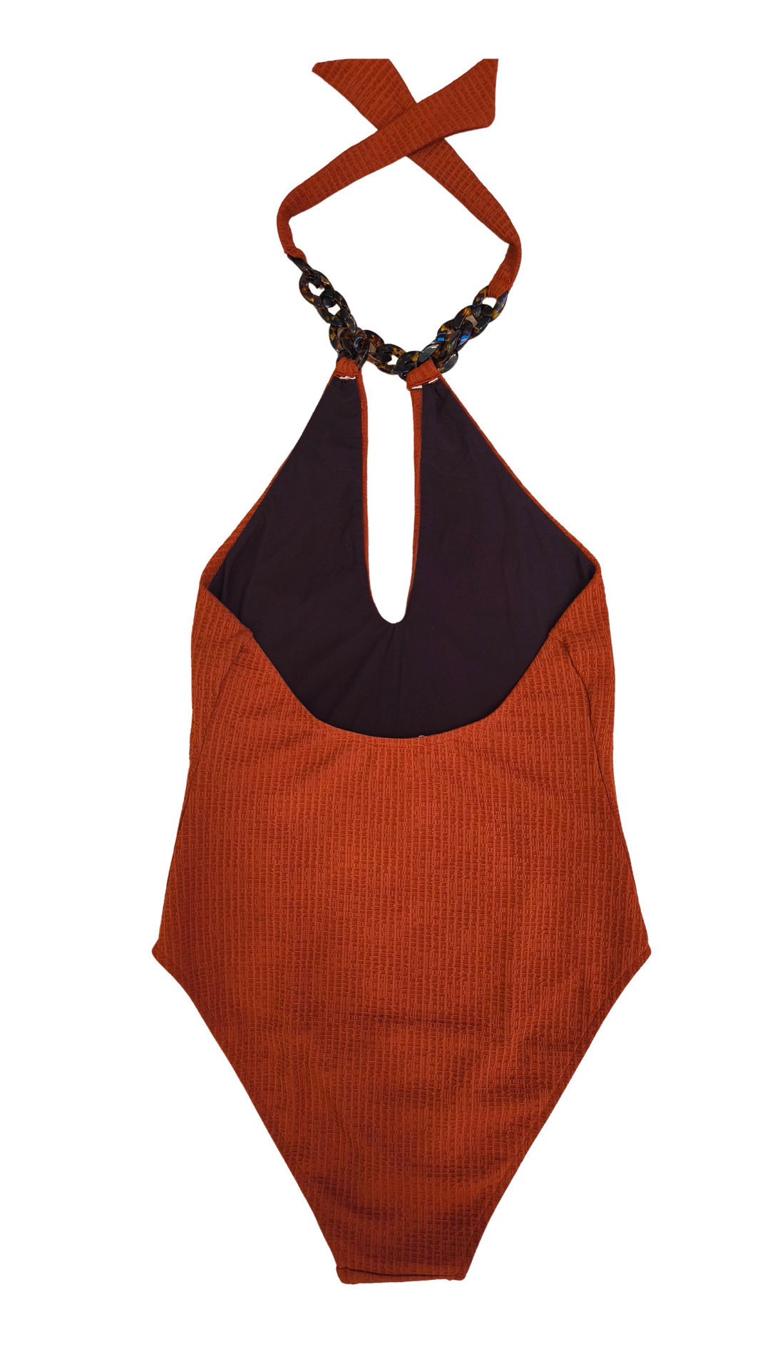 Elegante y sofisticado traje de baño confeccionado en un exquisito tejido estructurado jacquard en color caldera y escote en pico.